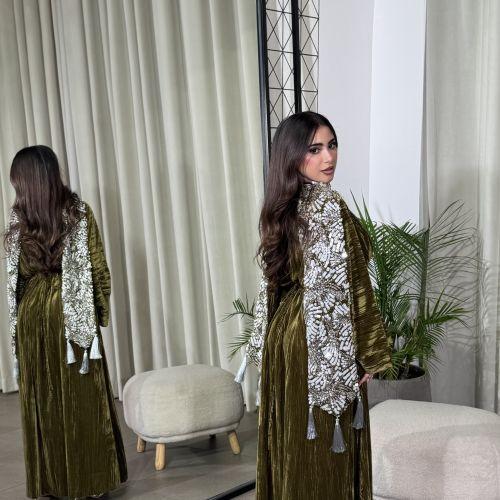 فري سايز بس نحتاج طول القطعه وطول الكم - قطعتين الدراعه/الفستان مع الشال المطرز بالكامل