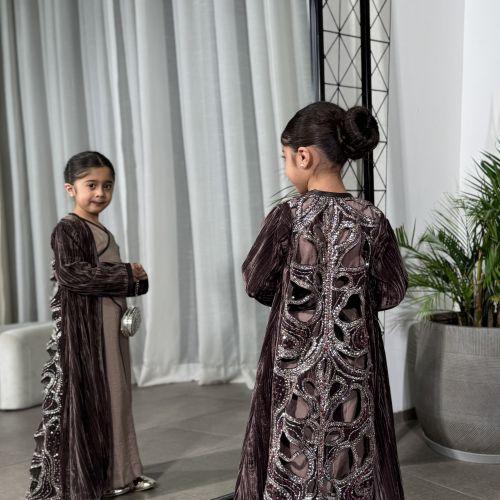 قطعه فخمه من اربع خامات ( مخمل بلسيه - جاكار - جلد - تطريز ) عباره عن قطعتين داخلي لف وربط على الجسم مع بشت التطريز